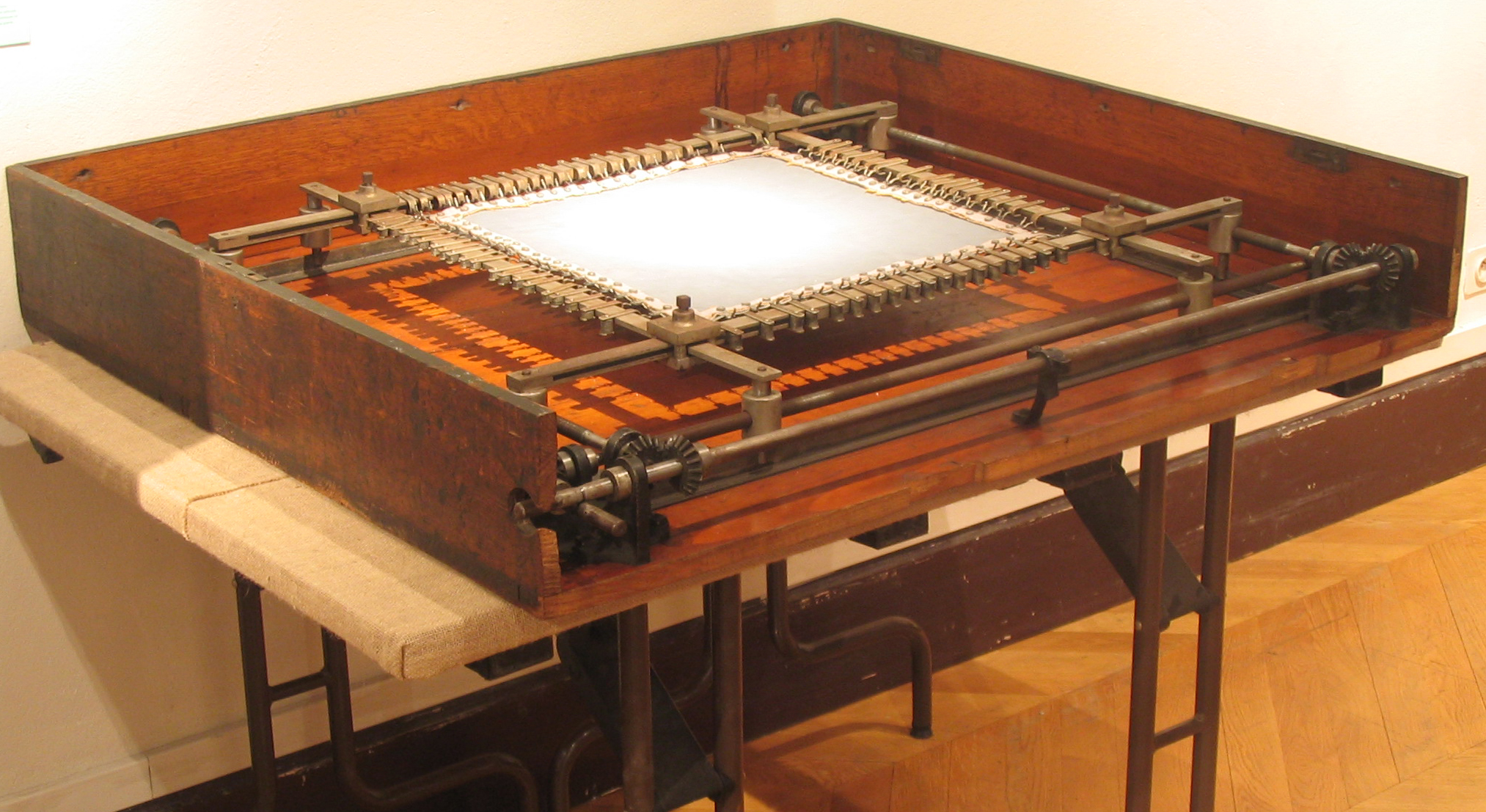 Avant que la photographie ne soit aussi largement utilisée par l’industrie de l’impression, les lithographes utilisaient cet appareil à l’apparence de trampoline pour modifier la taille de leurs dessins et même pour les anamorphoser. La plus connue de ces machines en France et en Angleterre est celle présentée ici, de type fougeadoire. Elle fut brevetée par A. M. Fougeadoire en 1889, bien que l’idée n’était en aucune façon nouvelle. Le principe qui sous-tendait cette utilisation était très simple : elle ne fait que renforcer l’idée que l’on se fait de son efficacité. Elle dépendait de l’élasticité d’une feuille de « caoutchouc » et de l’utilisation de vis pour ajuster sa tension. L’impression lithographique était alors transférée au caoutchouc, soit à l’état relâché soit lorsque celle-ci était tendue. Dans le premier cas, les vis étaient tendues afin d’élargir l’image, dans le second, elles étaient relâchées afin de la réduire. Les ballons de caoutchouc comportant des lettrages présentaient les mêmes effets visuels. Le changement maximum de taille rendu possible par une telle machine était un agrandissement ou un rétrécissement de 50 %, mais il était également possible de anamorphoser l’image en ajustant les vis de manière différente. De telles machines furent utilisées pendant une bonne partie de la fin du XIXe siècle, ce qui illustre bien le coût très élevé de l’introduction d’équipements photographiques à l’époque et le conservatisme naturel de la profession.