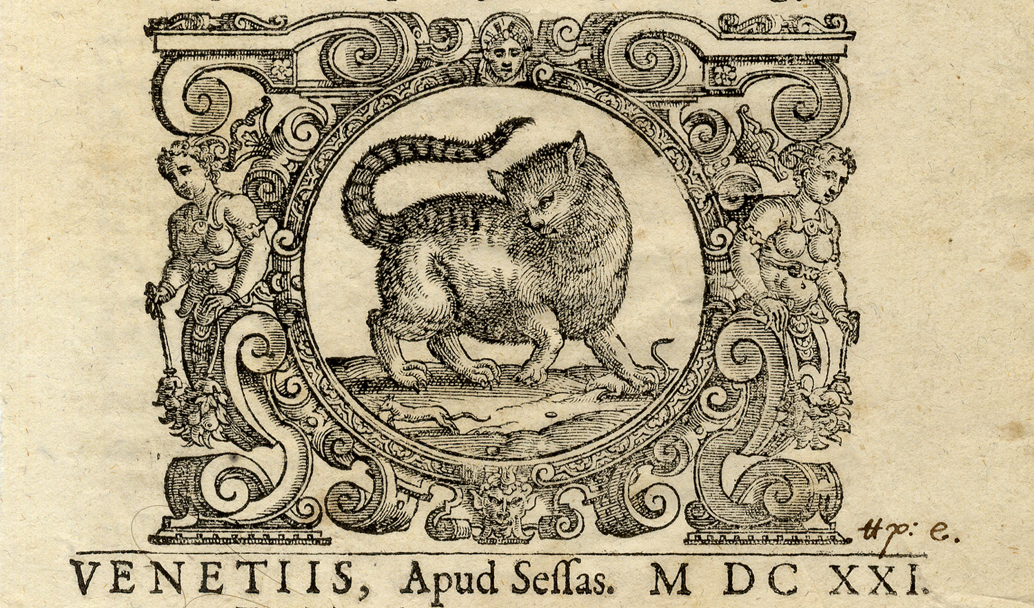 Cette charmante et inhabituelle marque typographique est celle des frères Sessa de Venise. Un chat pose sa patte sur une souris, alors qu’une autre lui file sous le nez. Dans d’autres versions de cette marque, le chat a la souris dans la gueule, ou se tient simplement assis, de face.