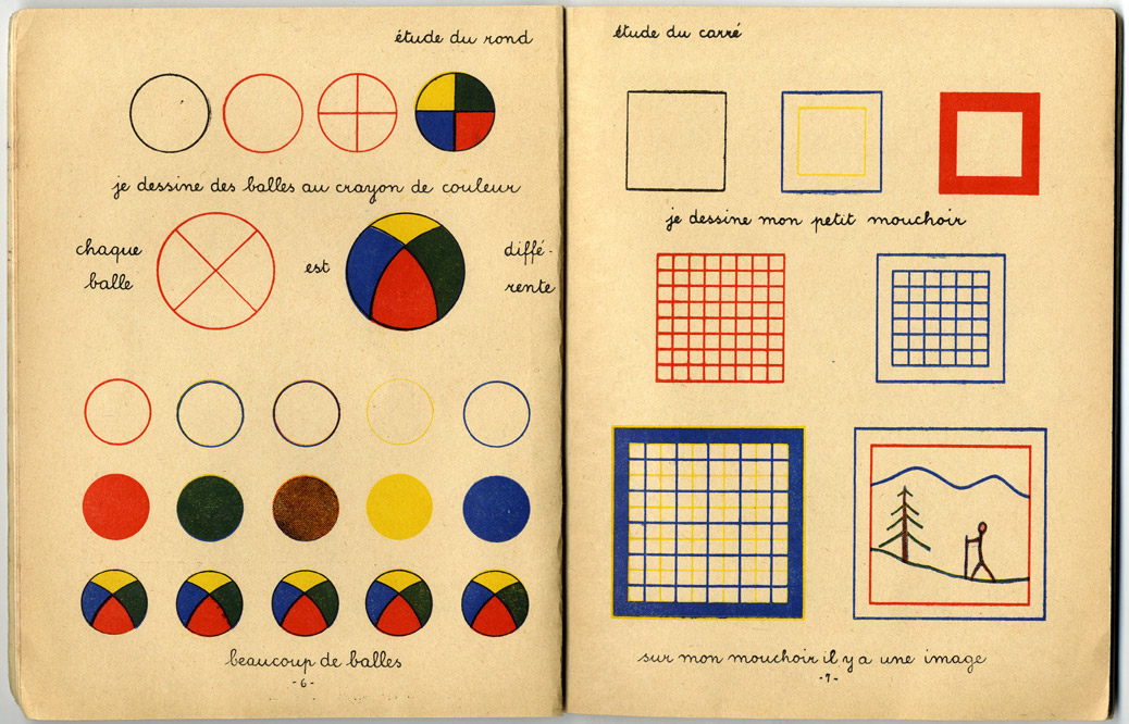 Les publications à visée pédagogique ne sont pas nécessairement des ouvrages scolaires sérieux. Les aspects ludiques sont fortement mis en avant dans ce manuel de dessin, qui simplifie le monde en formes géométriques faciles à reproduire. Destinés aux plus petits, les textes sont écrits avec d’enfantines lettres liées, et les textes sont rédigés à la première personne, des moyens simples et efficaces pour que le jeune lecteur s’implique dans la lecture du livre.