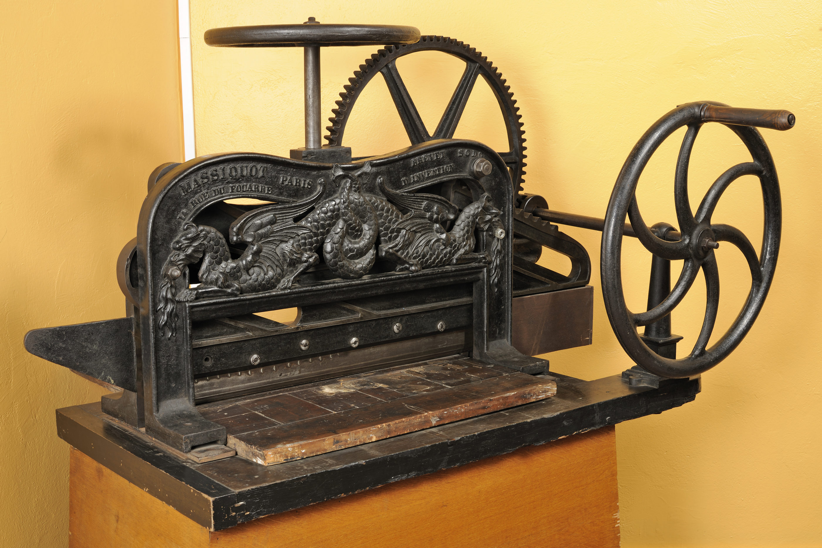 C’est en 1844 qu’un coutelier du nom de Massiquot construit, à Paris, un coupe-papier fonctionnant avec une lame fixée à un grand levier se manœuvrant à bras. Quelques années plus tard, il perfectionne le mécanisme, en remplaçant le bras par un système d’engrenages, permettait de donner à la lame une très grande force de pénétration dans la pile de papier. De nos jours, le massicot – le brevet a été déposé sous cette orthographe – sert toujours dans le secteur de l’imprimerie mais il ressemble peu à celui en fonte exposé ici.