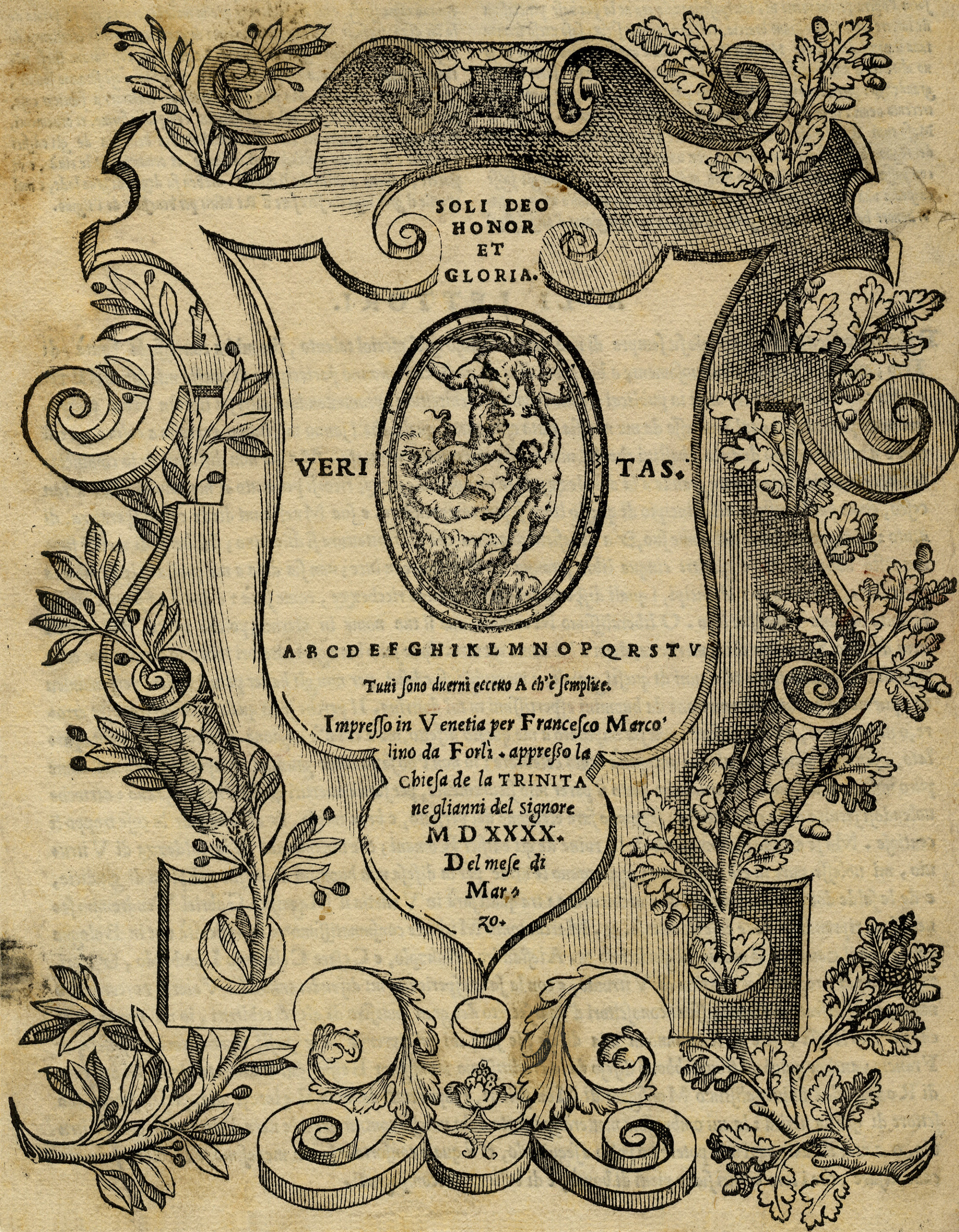 Édition vénitienne d’un traité sur l’architecture antique du grand architecte italien de la Renaissance, Sebastiano Serlio. Le colophon est ici prétexte à un décor exubérant qui mêle marque d’imprimeur, devise (Veritas filia temporis : la Vérité est la fille du Temps), lieu et date d’impression dans un volumineux encadrement gravé.