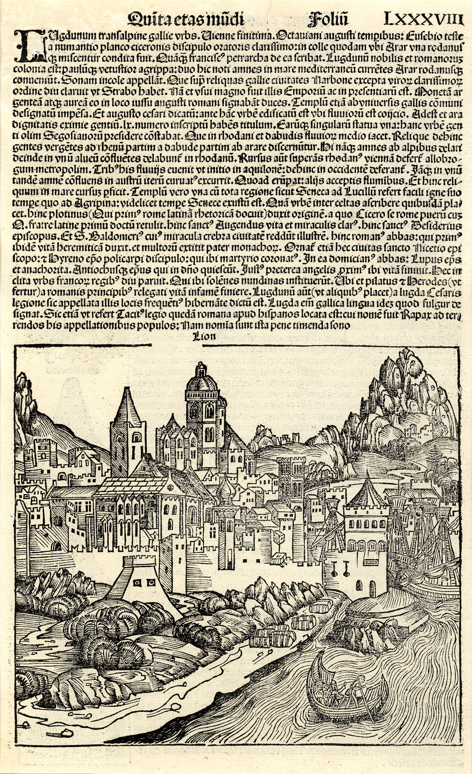 C’est un incunable exceptionnel par sa taille et ses magnifiques illustrations (dont certaines d’Albrecht Dürer). Le même bois gravé est souvent réutilisé pour représenter plusieurs villes (jusqu’à 11). L’image illustrant la ville de Lyon a également servi pour représenter Mayence !