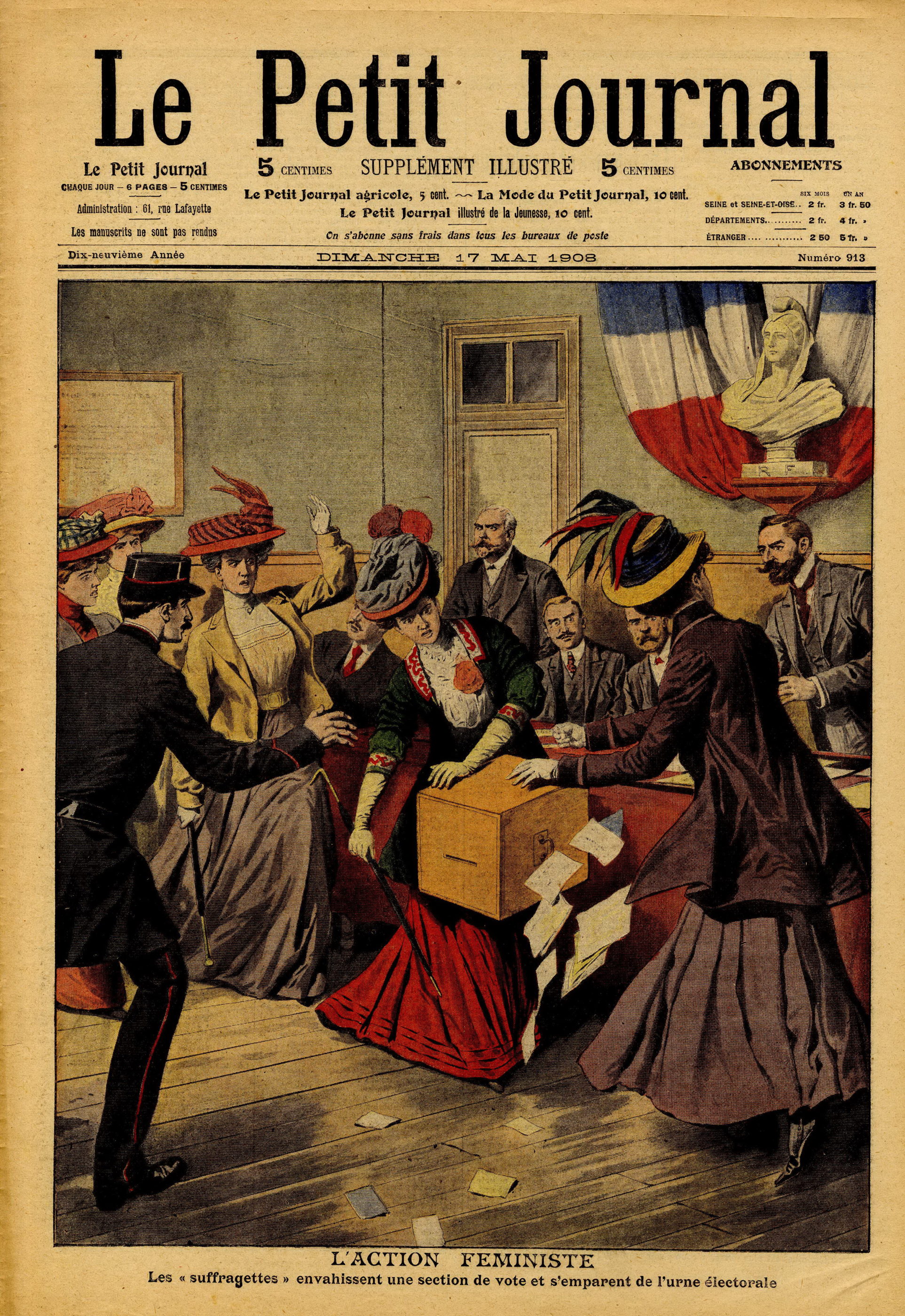 Le Petit Journal de Moïse-Polydore Millaud, fondé en 1863, est le premier à atteindre le tirage quotidien de plus d’un million d’exemplaires. Sensationnaliste, il sait jouer sur les émotions de ses lecteurs. Le Petit journal doit « exprimer ce que tout le monde pense » et « être clair jusqu’à la stupidité ». Après la Première Guerre mondiale, Millaud s’entend avec l’agence Havas sur le marché de la publicité pour se protéger mutuellement contre la concurrence. C’est le premier consortium. Ici, Le Petit Journal traite d’un sujet brûlant : des suffragettes qui réclament le droit de vote pour les femmes et investissent un bureau de vote, l’une des toutes premières actions de ce genre en France. Le Petit Journal, passe ses dernières années d’existence (1940–1944) à Clemont-Ferrand.