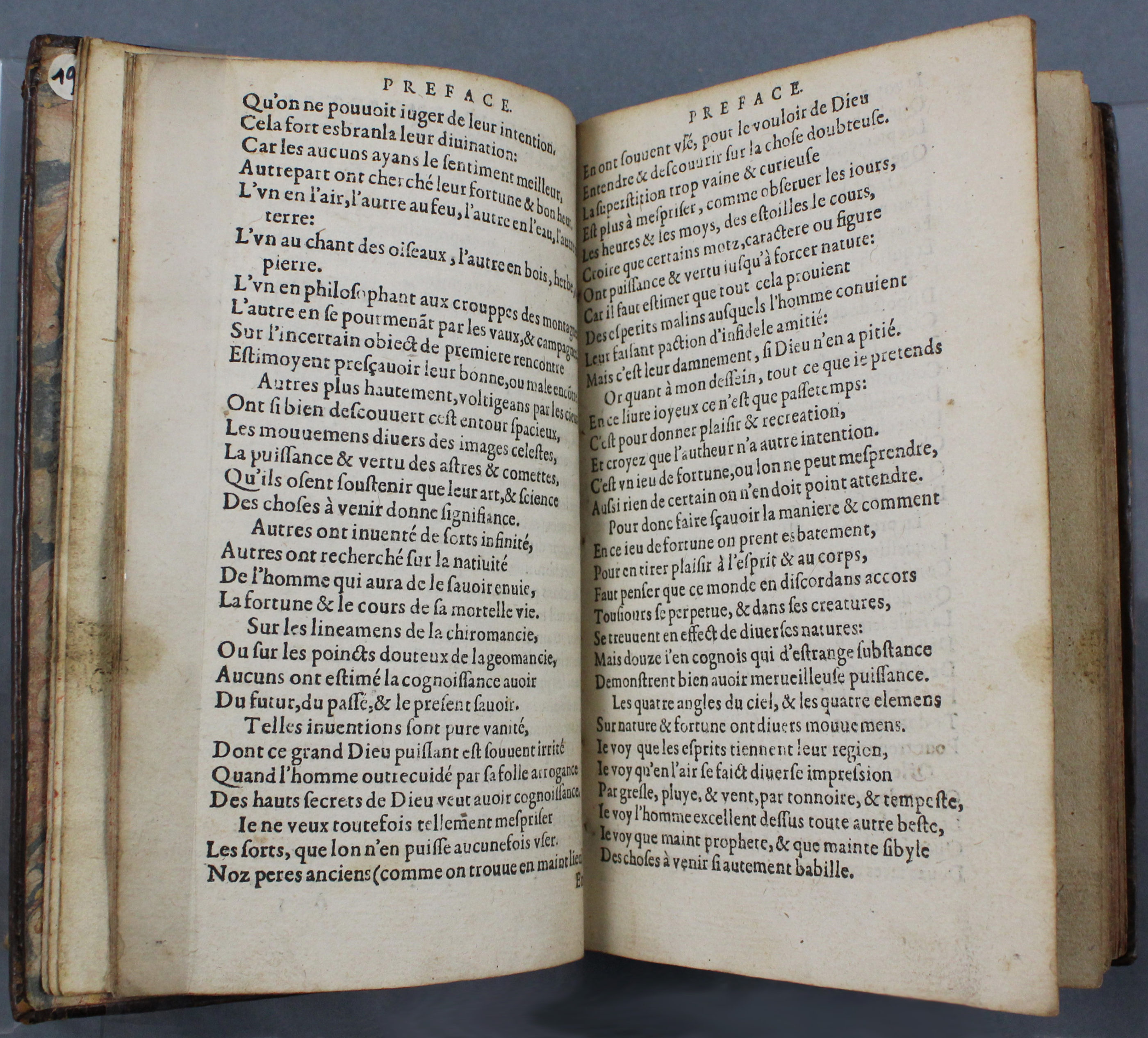 Le livre exposé traite du « dodechedron », un jeu qui utilise un dé à douze côtés, illustrés des douze signes zodiacaux, et qui permet de prédire l’avenir. Rappelons que le XVIe siècle n’est pas simplement celui de la redécouverte des textes antiques. C’est aussi celui de Nostradamus et des procès pour sorcellerie.