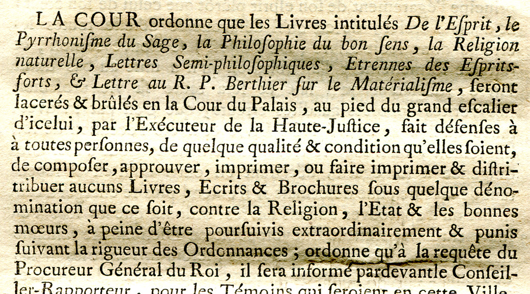 La publication de l’Encyclopédie de Diderot et D’Alembert a connu de nombreux remous : interdiction, censure, retrait du privilège, procès. Jésuites et philosophes s’affrontent par « réfutations » interposées, la polémique attisant par ailleurs l’intérêt du public. En janvier 1759, la condamnation par le parlement de Paris fait peser de graves menaces sur l’entreprise et sur son directeur, Diderot. Plus tard, ce sera Le Breton, l’imprimeur de l’Encyclopédie, qui censurera les articles compromettants, contre l’avis des auteurs.